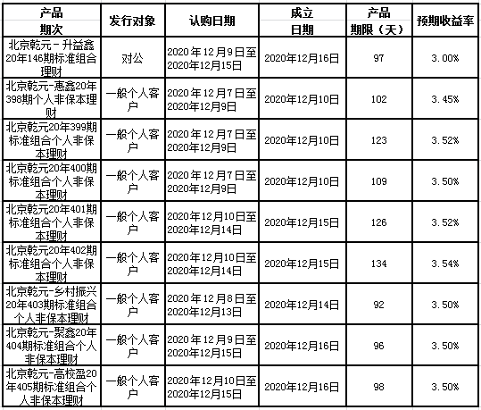 中国建设银行北京市分行定于2020年12月7日至2020年12月11日发行理财产品,现将相关发行情况公告如下: