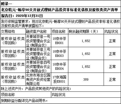 中国建设银行北京市分行“乾元—畅享”90天开放式资产组合型人民币理财产品(机构版)于2018年12月11日正式成立。截至报告日,本产品规模为326,124,000.00元,杠杆水平符合监管要求。