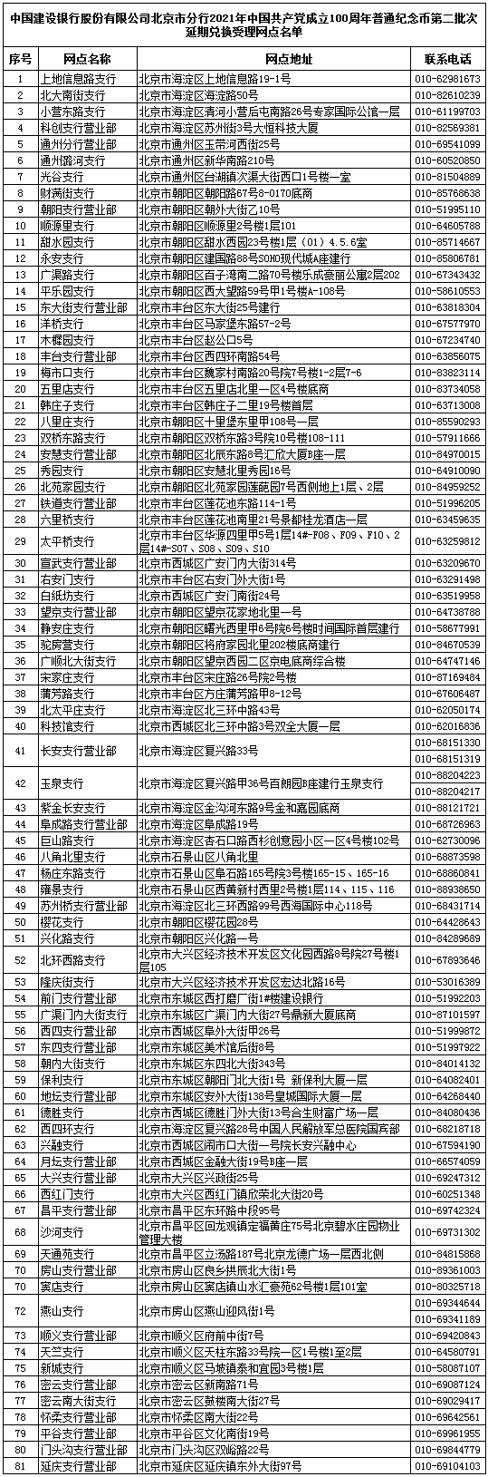 因隔离导致无法如期(2021年11月1日至 11月7日)兑换第二批次建党币的社会公众,可在上述工作时间致电已预约成功网点,申请获取延期兑换资格。