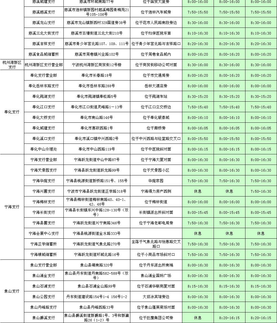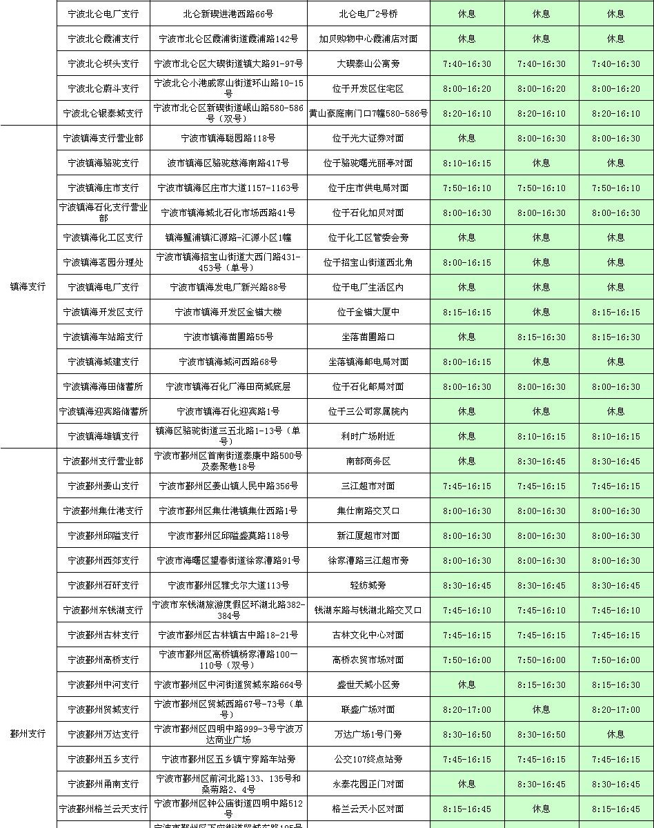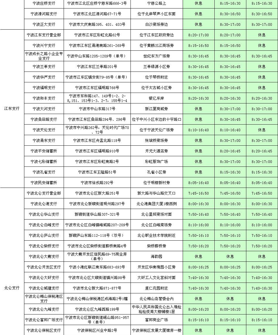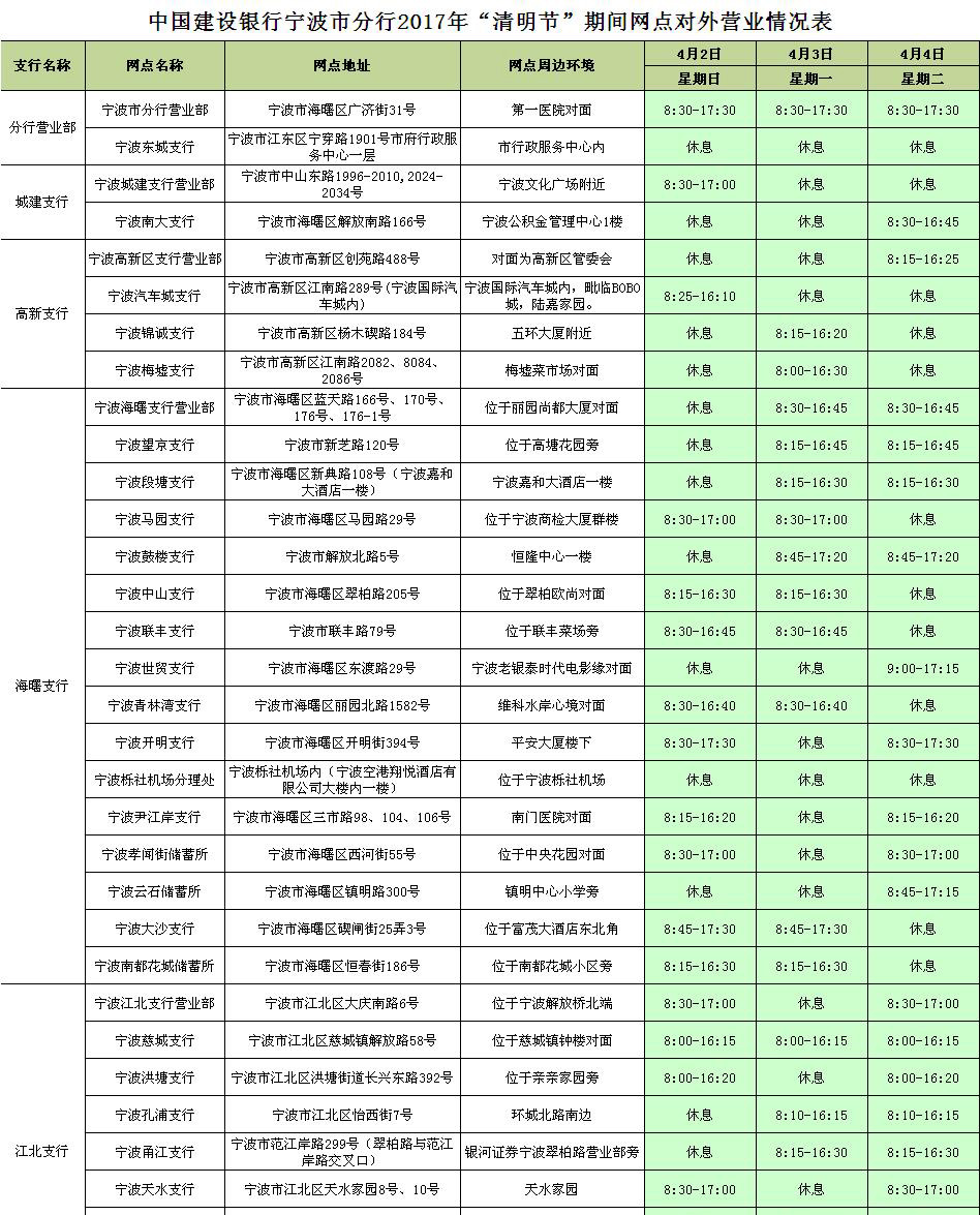 宁波分行2017年清明节期间网点对外营业情况表